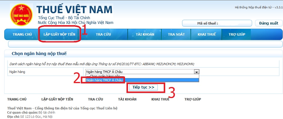Bước 2: Anh/Chị bấm vào lấy giấy nộp tiền => chọn số tài khoản ngân hàng cần nộp (nếu đã lập giấy nộp tiền trước đó thì bấm vào lại TRA CỨU)