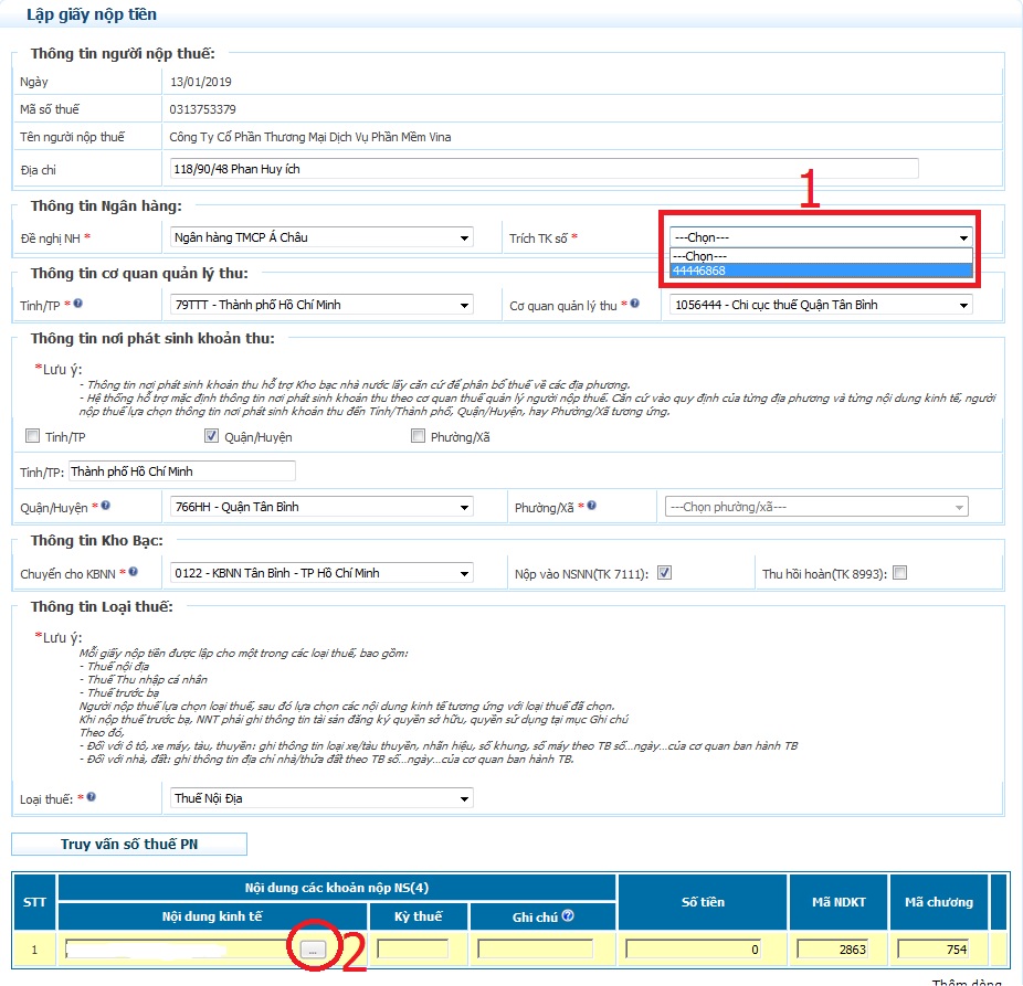 Anh/Chị chọn số tài khoản Ngân Hàng và chọn Nội Dung Kinh Tế (xem hình ảnh dưới)