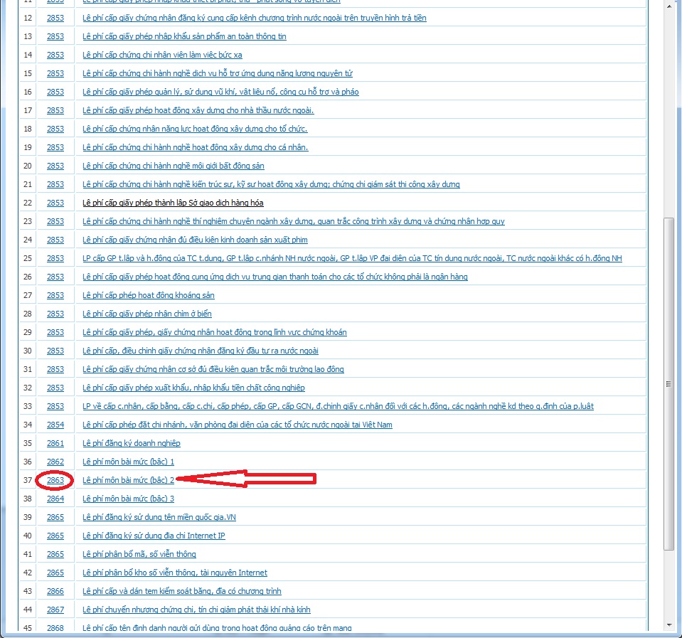 Sau khi chọn tiểu mục 2850 Anh/Chị tiếp tục chọn đến Mã NDKT 2861 2862 2863 Tương ứng với 3 bậc thuế MÔN BÀI (Ở đây chúng tôi chọn bậc 2 cho doanh nghiệp có vốn điều lệ dưới 10 tỷ)