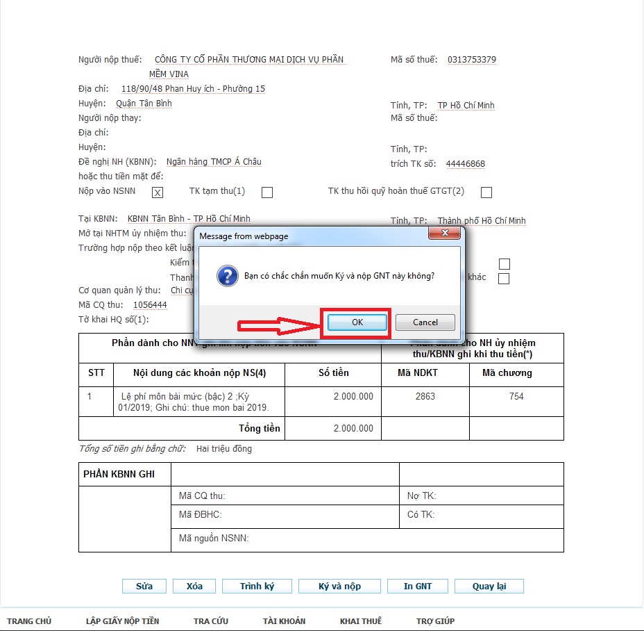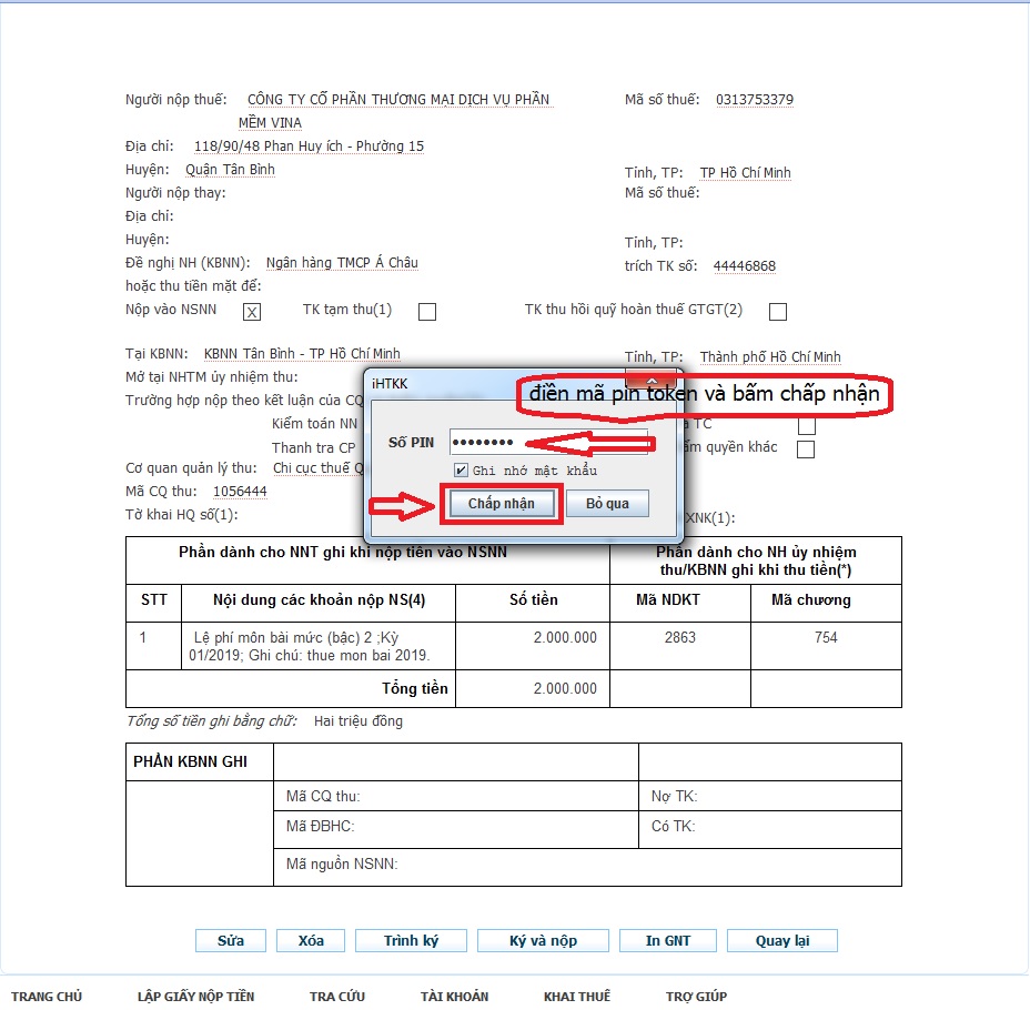 Như vậy là đã xong Anh/Chị đợi vài giây để token ký và gởi giấy nộp tiền